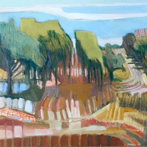 I spend a lot of time in nature. I collect information on site and work on small sketches, when satisfied I start painting with a big brush, the shapes and patterns emerge. The fun and discipline, is choosing what to enhance and what to loose, it is this "process"stage of painting that I love so much, when all possibilities and options are vying for consideration.